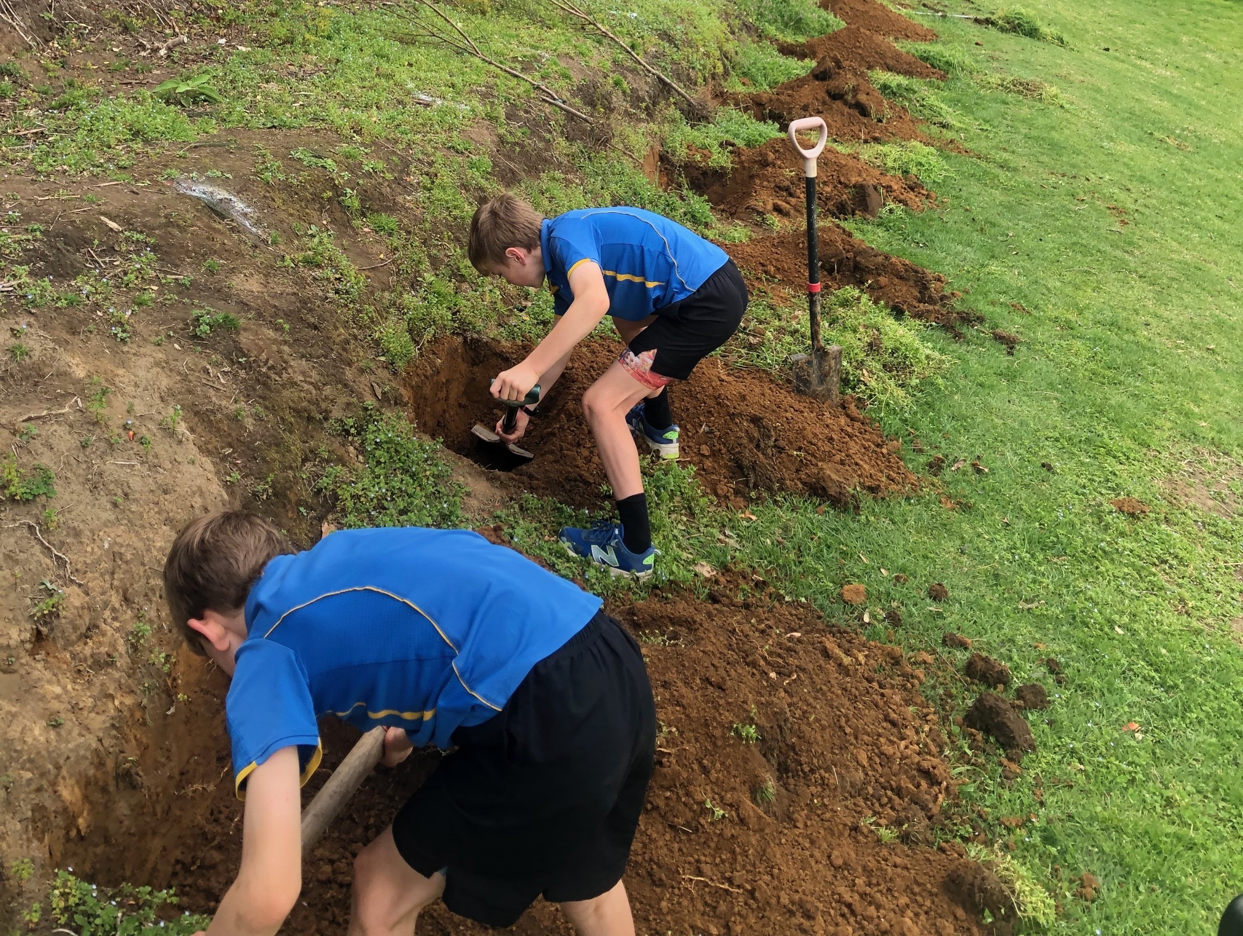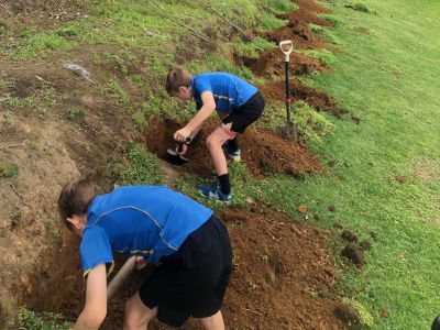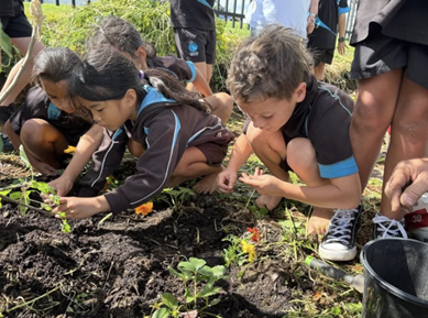 Students from Omokoroa N.1 School plant out their fruit orchard.